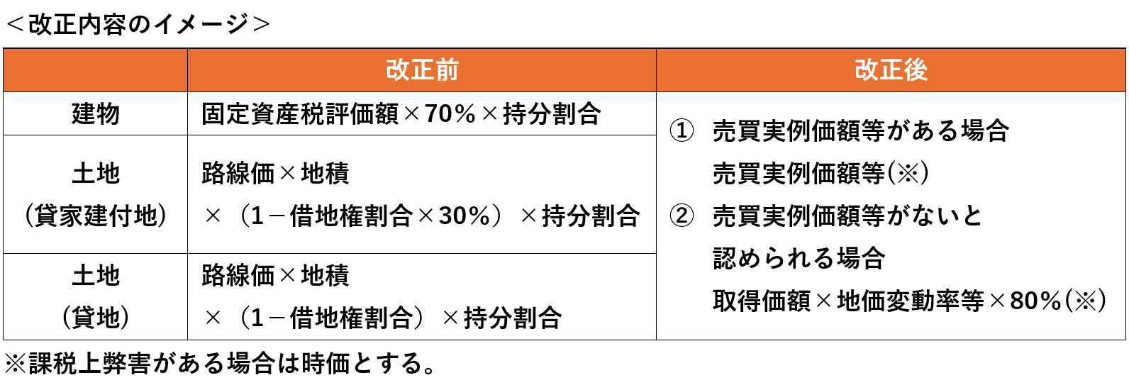 ただし、改正を通達に定める日(以下「改正日」という。)までに、被相続人等が改正日の5年前から所有している土地に新築をした家屋(改正日に建設中のものを含む)については、改正前の評価額となります。